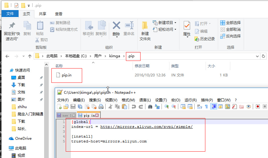 windows:在当前用户根目录下,创建.pip和这个文件夹,然后在里面新建一个文件pip.in 里面的内容为