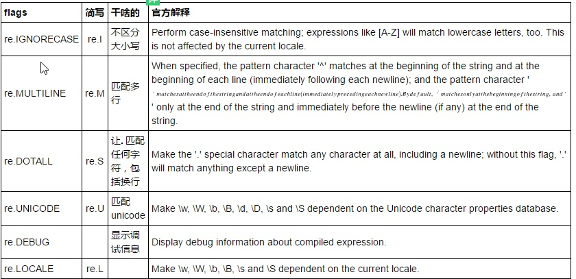 最后flags=re.S 表示,(.*?)中的 . 可以匹配包括换行符(见下面表)