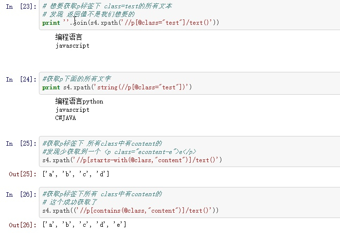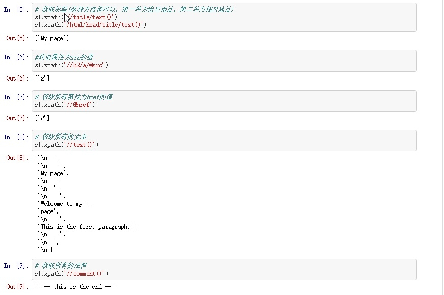 第四个案列 1 2 3 4 5 6 7 8 9 10 11 12 13 14 15 16 17 18 19 20 21 22 23 24 sample4 = u""" <html> <head> <title>My page</title> </head> <body> <h2>Welcome to my <a href="#" src="x">page</a></h2> <p>This is the first paragraph.</p> <p class="test"> 编程语言<a href="#">python</a> <img src="#" alt="test"/>javascript <a href="#"><strong>C#</strong>JAVA</a> </p> <p class="content-a">a</p> <p class="content-b">b</p> <p class="content-c">c</p> <p class="content-d">d</p> <p class="econtent-e">e</p> <p class="heh">f</p> <!-- this is the end --> </body> </html> """ s4 = etree.HTML(sample4)