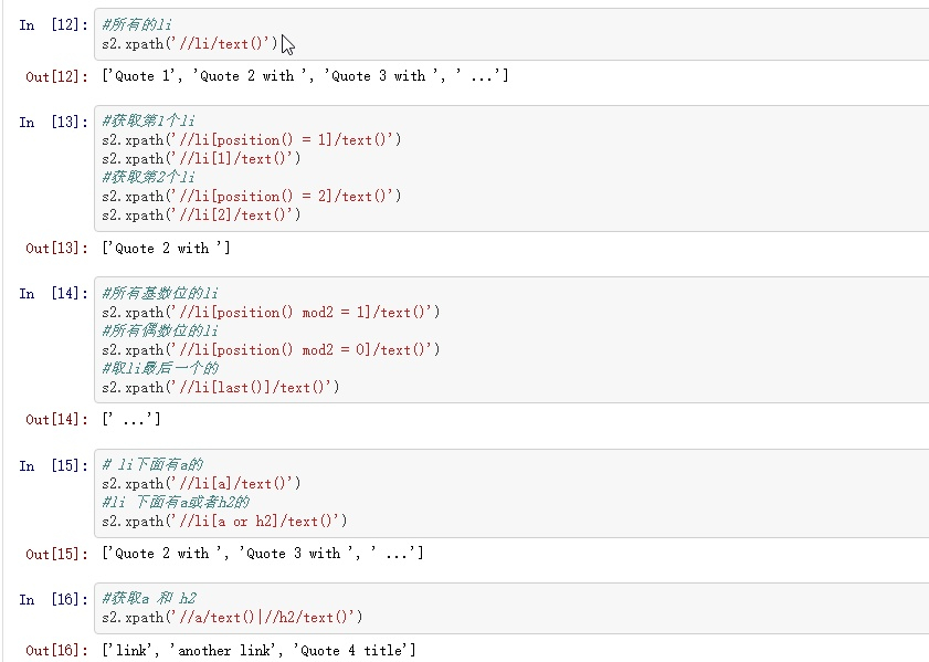 第二个案列 1 2 3 4 5 6 7 8 9 10 11 12 13 sample2 = """ <html> <body> <ul> <li>Quote 1</li> <li>Quote 2 with <a href="...">link</a></li> <li>Quote 3 with <a href="...">another link</a></li> <li><h2>Quote 4 title</h2> ...</li> </ul> </body> </html> """ s2 = getxpath(sample2)