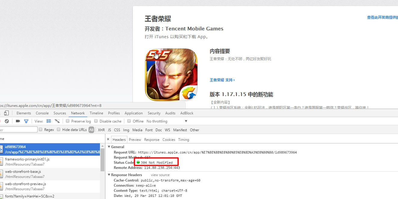 当我第一次打开王者荣耀:在 App Store 上的内容网页的时候,再次刷新的时候,你会看到http状态码返回 304