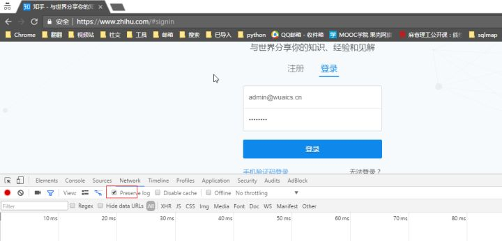 注意打开开发者工具后点击“preserve log”,密码记得故意输入错误,然后点击登录