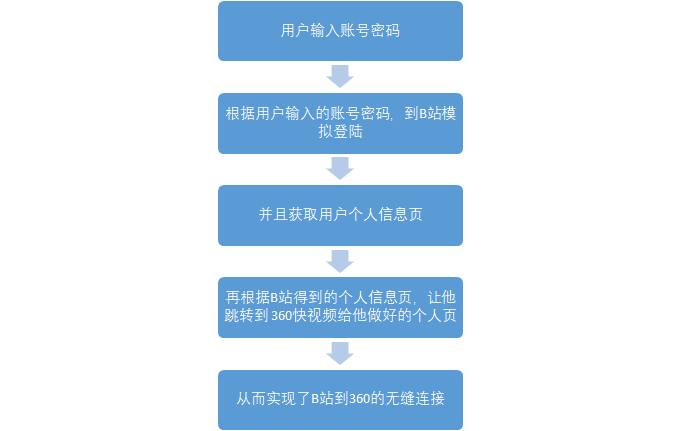 简单的讲就是 当你在360快视频输入账号密码的时候,我把你的账号密码拿去B站模拟登陆,登陆成功则获取你在B站的个人页,然后让你跳转到360快视频对应的个人页,