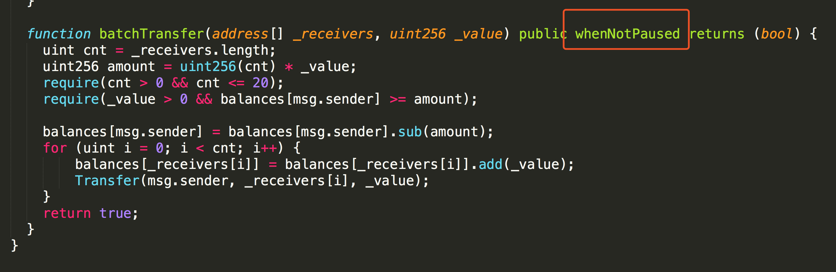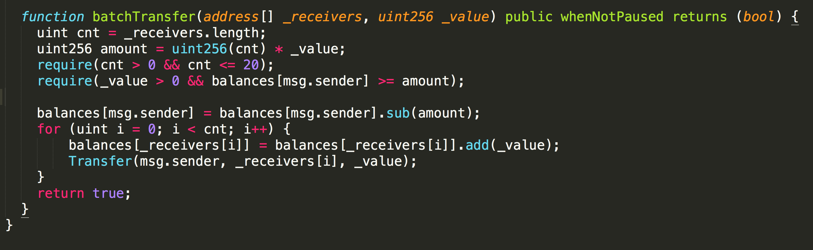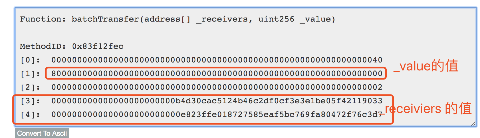 是获取 _receivers 里面有几个地址,我们从上面可以看到 参数里面只有两个地址,所以 cnt=2,也就是 给两个地址发送代币