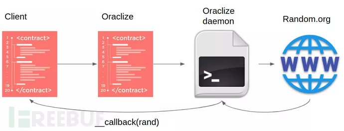 在以太坊上,Oraclize是为链上节点提供随机数的第三方。Oraclize是一个预言机,独立于区块链系统之外,智能合约发送请求给Oraclize,当Oraclize监听到链上相关请求后,生成随机数并将结果返回区块链。