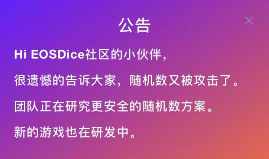 **EOSDice是一个被黑客用第一种方法攻破后,修改了伪随机数算法,旋即又被黑客用第二种方法攻破的DApp。**不过,值得赞赏的是,EOSDice也是一个被攻破两次但依然坚持开源的 EOS游戏。