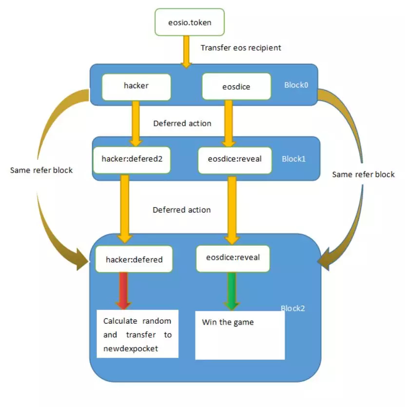 在EOSDice 的实时开奖机制中,开奖action的reference block在默认状态下是执行当前action的上一个区块,该区块已经存在,其信息可以提前获取。因此,黑客可以通过种子预先算出结果,再下注。
