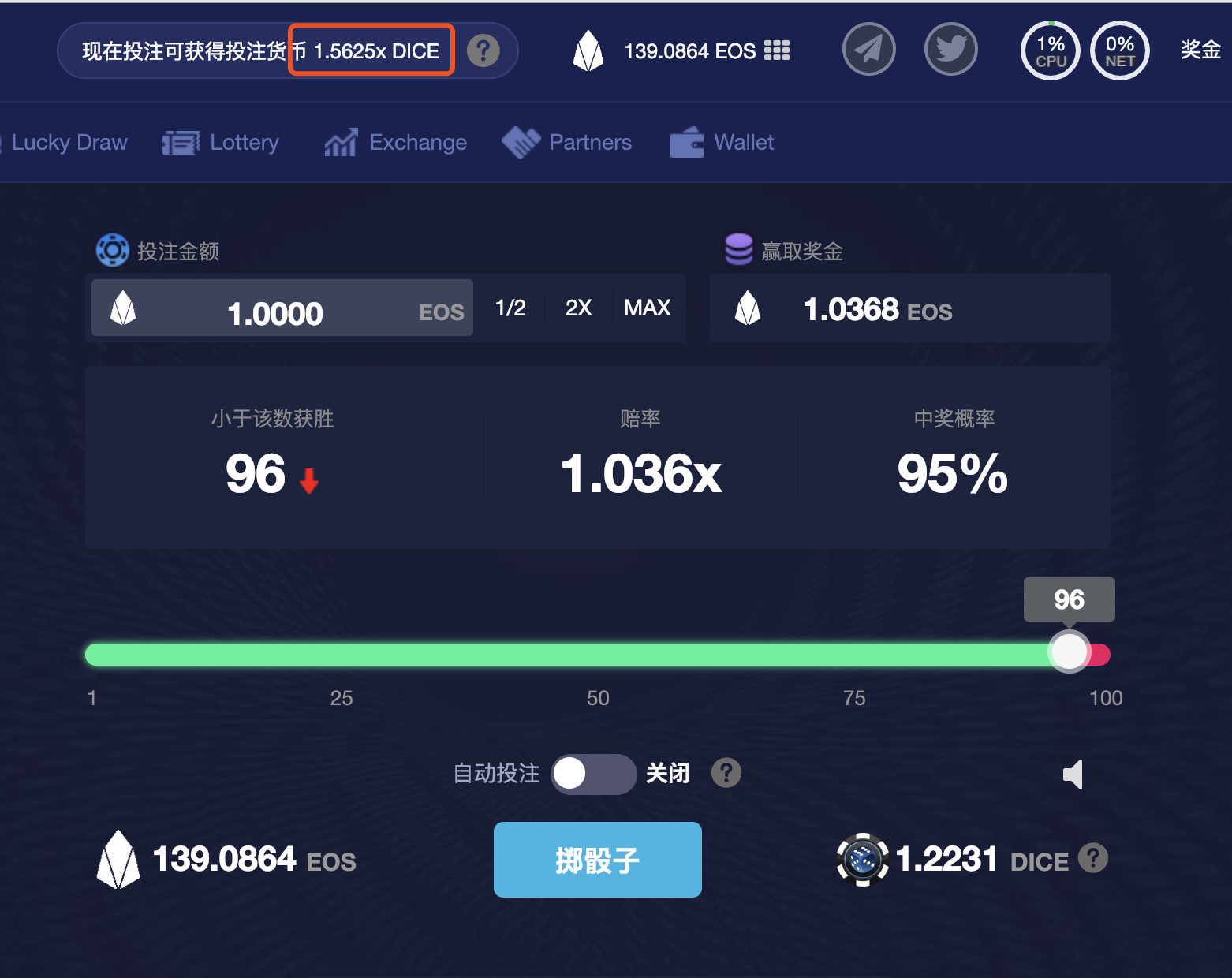 则我可以算出来 我玩1个EOS理论上输多少EOS 1.036*0.95=0.9842 1-0.9842=0.0158