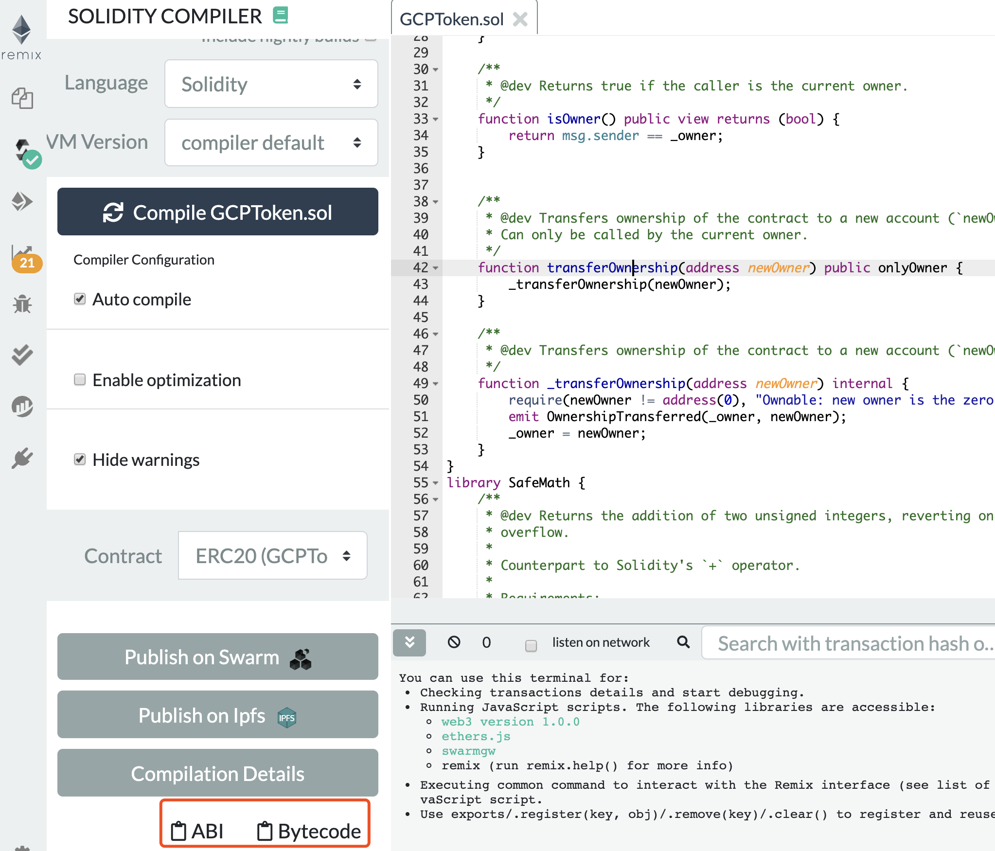 编译好了就可以拿到ABI 以及 Bytecode了.(后面用)